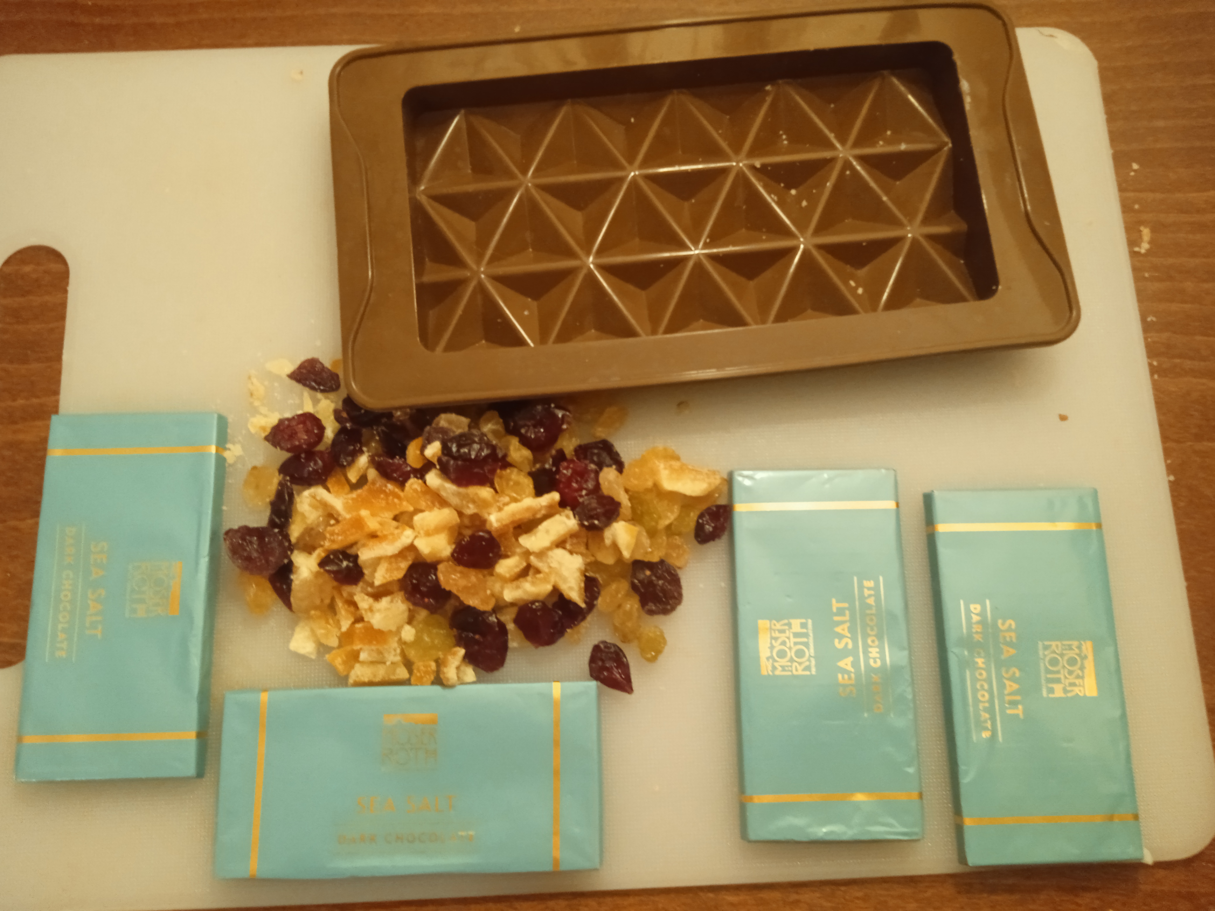 • Pour mixture into silicone mould. Fold in extras like my choice of cranberries, candied orange peel in, or play with other options such chopped almonds, raisins, or puffed rice for texture.